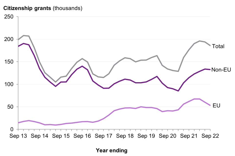 The number of grants of citizenship for the registration of children of former EU citizens rose by 46% to 14,132 compared with 2019. For former non-EU citizens there were 31,502 grants in the year ending September 2022, 24% higher than 2019.