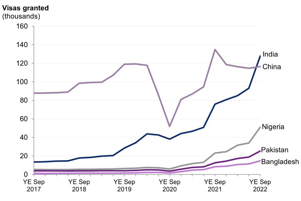 Figure 2: Sponsored study visas granted to main applicants, years ending September 2017 to 2022, top 5 nationalities