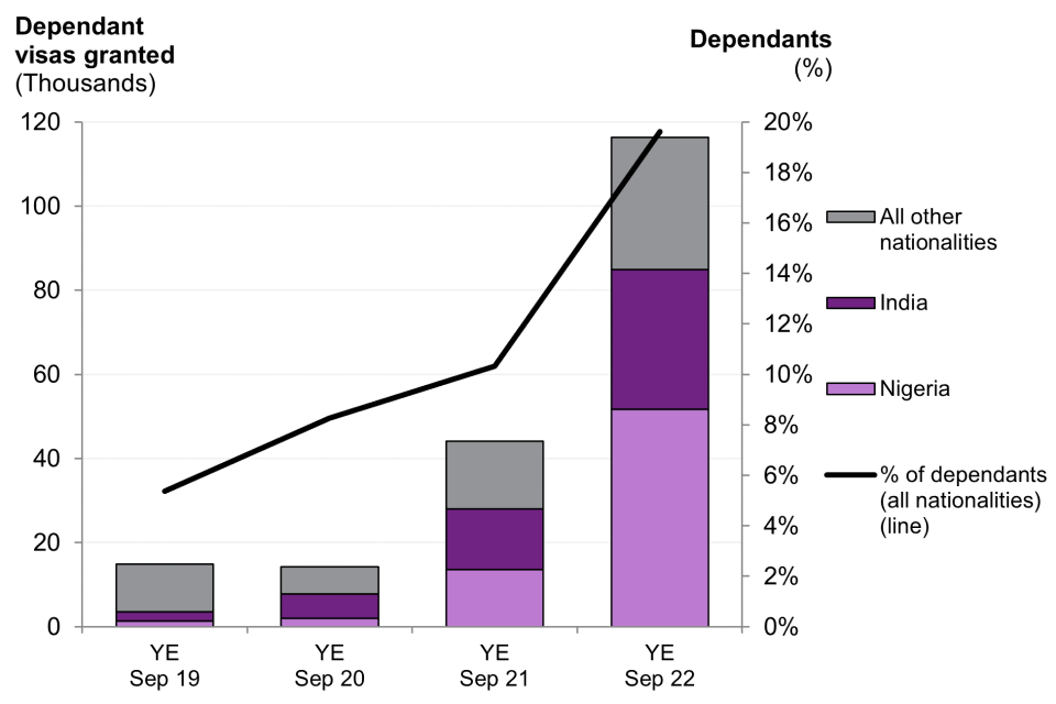 Outside of the top 5 nationalities for dependant visas issued (Nigeria, India, Pakistan, Bangladesh and Sri Lanka), the increase in proportion was more modest (from 4% to 6%).