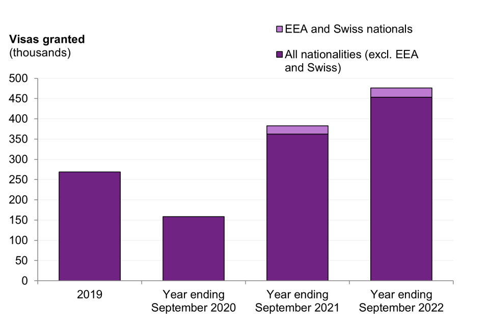 Global events such as the world recovery from the COVID-19 pandemic and international events (war in Ukraine, Taliban takeover in Afghanistan and National Security Law in Hong Kong), along with policy changes introduced as part of the new Immigration system and the end of EU freedom of movement, have all had an impact on migration. As a result, we are seeing large increases in numbers of visas granted on some of the most commonly used routes in the year ending September 2022, with large increases for sponsored study, non-temporary work and dependants of students and workers, as well as on the new humanitarian routes (for people from Ukraine and Afghanistan, and the BN(O) visa route from Hong Kong).