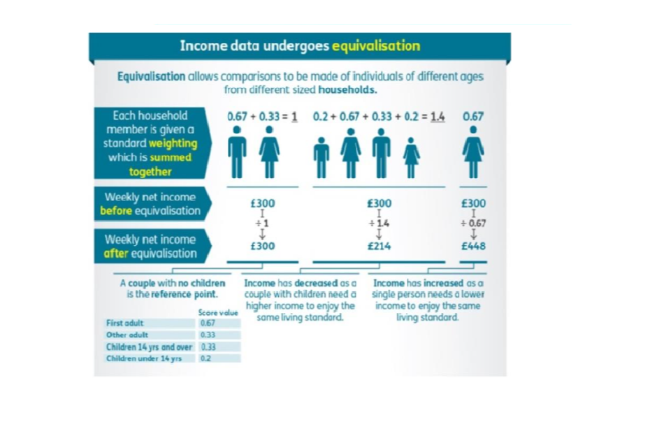 In order to estimate the amount of household income available to an individual in that household, we adjust it according to the size and composition of the household. This adjustment is called equivalisation. Equivalisation aims to make individual incomes comparable. It does this by giving each household member a weighting; this is summed together to provide a household weighting factor. Household weekly net income is divided by that factor to give an equivalised income which is the same for each member of the household. The process of equivalisation results in the income of a single person being adjusted upwards, and that of an individual in a household containing children being adjusted downwards.