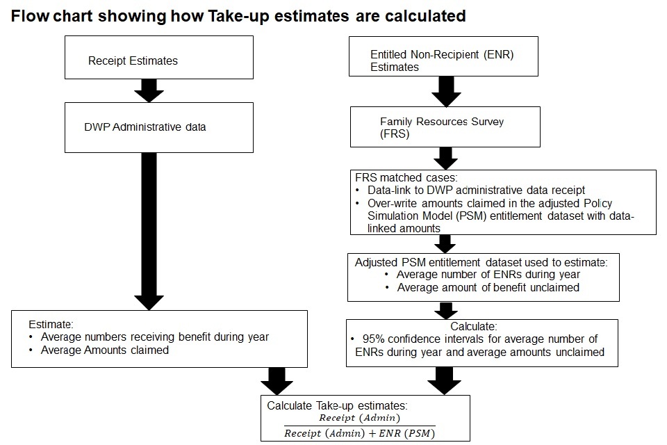 The strength of the methodology introduced for the FYE 2014 analysis (and also retrospectively applied to FYE 2010 and FYE 2013) is that it makes more use of existing administrative data alongside data from the FRS and Policy Simulation Model (PSM) to estimate take-up. The strength of the methodology introduced for the FYE 2018 analysis (and also retrospectively applied to FYE 2017) is that it provides an improved approach to estimating eligibility of caseload and expenditure take-up.