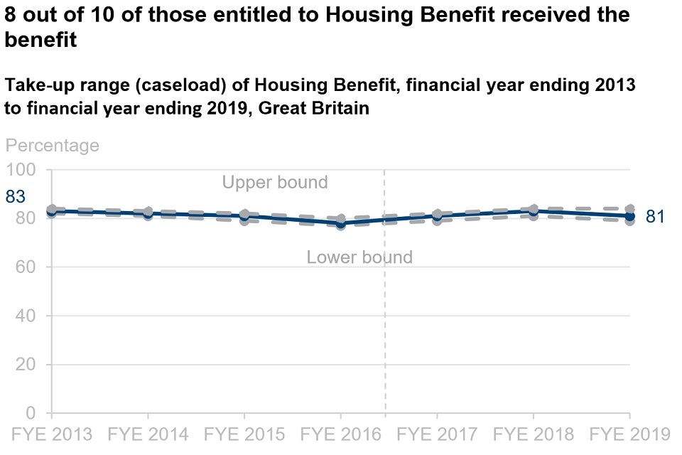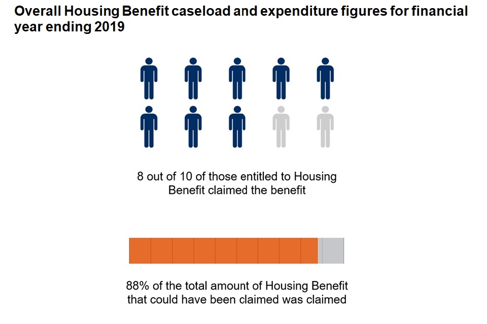 • caseload – 8 out of 10 of those entitled to Housing Benefit claimed the benefit