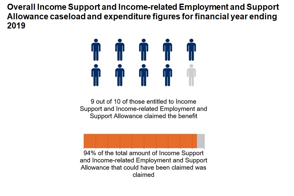• caseload – 9 out of 10 of those entitled to Income Support or Income-related Employment and Support Allowance claimed the benefit