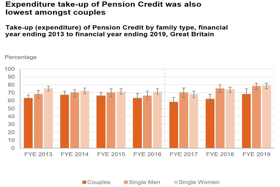 There have been broadly consistent trends in the take-up of Pension Credit between couples, single men and single women since FYE 2013. For the FYE 2019, expenditure take-up of Pension Credit by couples (68%) continued to be lower than that of single males (78%) and single females (79%). The difference between couples and single females is statistically significant.