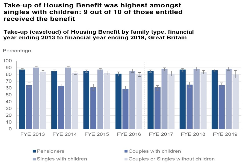 Take-up of Housing Benefit also varies by family type with consistent patterns between groups seen since FYE 2013. In FYE 2019 singles with children (88 %) and couples or singles without children (80%) had higher take-up rates than couples with children (64%). Both these differences are statistically significant. Pensioners had a higher take-up rate (86%) than non-pensioners overall (79%).