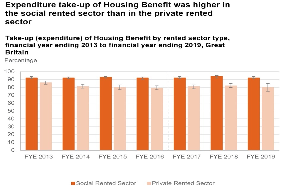 Expenditure take-up of Housing Benefit varied by rental sector and has done consistently since FYE 2013. For the FYE 2019, the expenditure take-up rate for families in the social rented sector (92%) continued to be higher than the expenditure take-up rate for families in the private rented sector (80%). This difference was statistically significant.