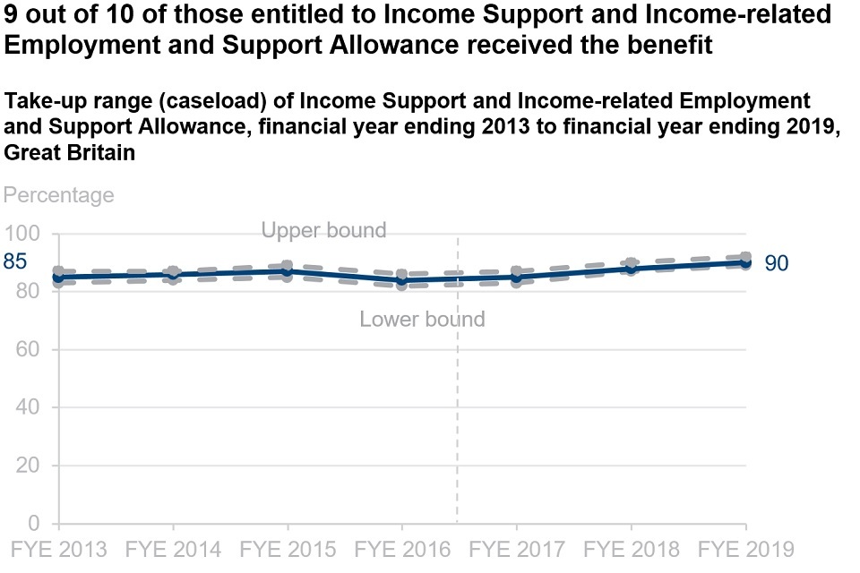 An estimated 90% of families who were entitled to Income Support or Income-related Employment and Support Allowance in FYE 2019 received the benefit. This was 2 percentage points higher than in FYE 2018 and 5 percentage points higher than FYE 2013. The trend has been broadly stable since FYE 2013.