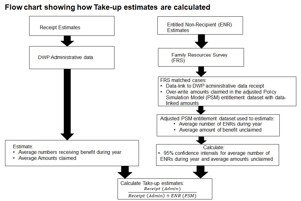 The methodology for deriving the estimates of take up is complex. Figures in this report are based on Department for Work and Pensions (DWP) administrative data, local authority administrative data and data from the Family Resources Survey (FRS). The survey data from the FRS are then modelled using a static microsimulation model known as the Policy Simulation Model (PSM). The PSM is a model of the tax and benefit system of the UK. The source data for the model comes primarily from the FRS with benefit and tax credits entitlement and tax or National Insurance liability calculated for each FRS family.