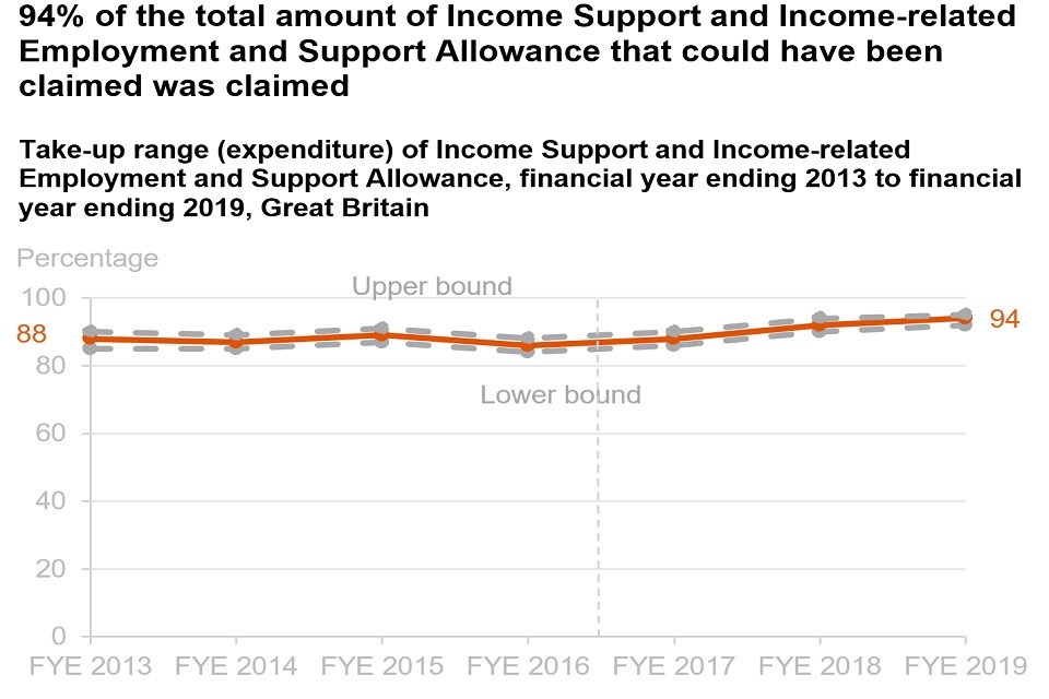 In FYE 2019, an estimated 94% of the total amount of Income Support or Income-related Employment and Support Allowance that could have been claimed was claimed. This was 2 percentage points higher than in FYE 2018.