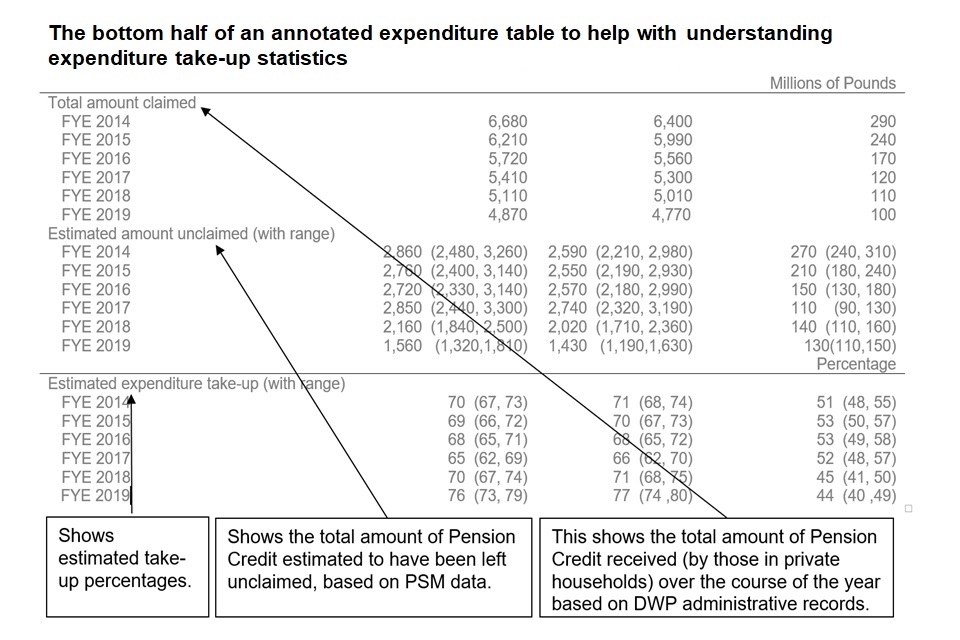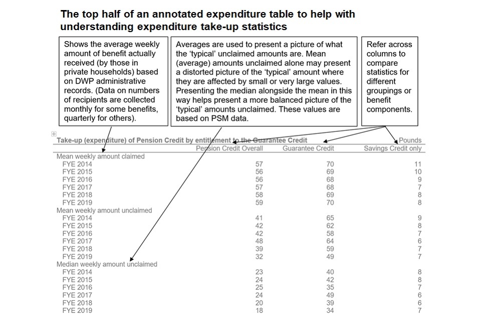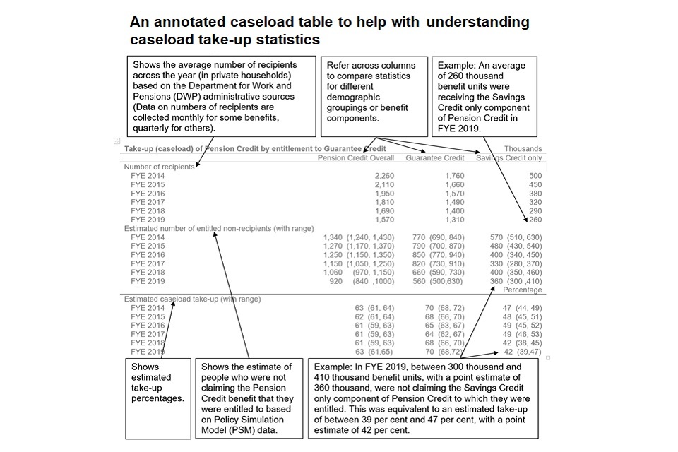 There are two basic types of table presented in this publication – one that contains statistics related to the caseload measure of take-up and a second that contains statistics related to the expenditure measure. The following illustrations are intended as a guide to interpreting the online tables for each benefit.