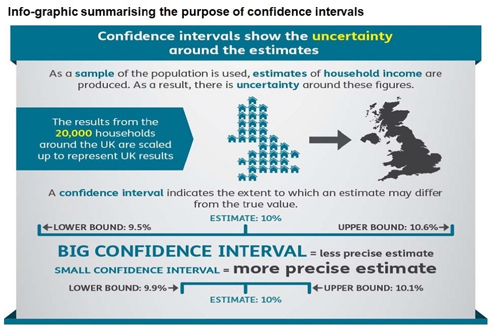 A measure of sampling error. A confidence interval is a range around an estimate which states how likely it is that the real value that the survey is trying to measure lies within that range. A wider confidence interval indicates a greater uncertainty around the estimate. Generally, a smaller sample size will lead to estimates that have a wider confidence interval than estimates from larger sample sizes. This is because a smaller sample is less likely to reflect the characteristics of the total population and therefore there will be more uncertainty around the estimate derived from the sample. Note that a confidence interval ignores any systematic errors that may be present in the survey and analysis processes.