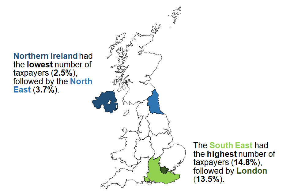 the South East had the highest number of Income Tax payers at 14.8% in 2018 to 2019, while London had the second highest at 13.5%