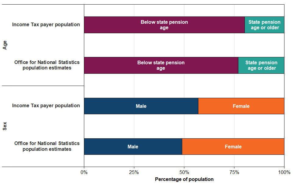 Published estimates for 2019 to 2020 indicate there are 6.25 million Income Tax payers (19.9%) over the state pension age. The ONS population estimate for mid-2020 instead found that 23.0% of the population who were 16 or over were of state pension age, indicating that this demographic are underrepresented in the Income Tax payer population. For this publication, the state pension age is set as 65.75 years for both sexes in the 2019 to 2020 tax year (reflecting the average age in that year as the state pension transitions up to 66), increasing to 66 years in the subsequent tax years through to 2022 to 2023 inclusive.