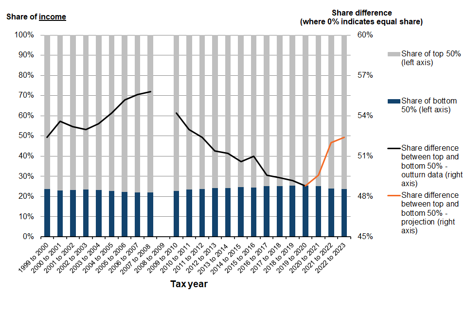 In 1999 to 2000, income inequality between the bottom and top 50% of Income Tax payers was highlighted by a 52.4 percentage point difference in their share of total income before tax: the bottom 50% had 23.8% whilst the top 50% had 76.2%. Inequality by this measure grew in the years leading up to the 2008 recession, showing a 55.8 percentage point difference in 2007 to 2008 (77.9% for the top 50% compared to 22.1% for the bottom 50%). Since then, income inequality has continually decreased, returning to 1999 to 2000 levels by 2011 to 2012 and declining thereafter up to 2020 to 2021. In 2019 to 2020 there was a 48.8 percentage point difference in share of total income before tax, and this measure of income inequality is expected to increase to 52.4 percentage points in 2022 to 2023.This is in part driven by the wages growth in the top 50% in 2021 to 2022 where income inequality increases 2.4 percentage points from 2020 to 2021. It is important to note that the population of Income Tax payers used in these calculations differ each tax year due to variations in the number of individuals liable to Income Tax, which depends in part on Income Tax policy measures at that time. Shares of total income would differ if non-Income Tax payers were included.