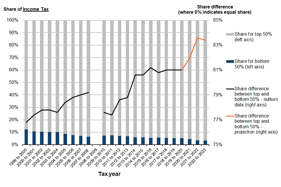 Figure 6: Share of total Income Tax for bottom and top 50% of Income Tax payers (ranged on total income). Note that the 2008 to 2009 SPI data is unavailable.