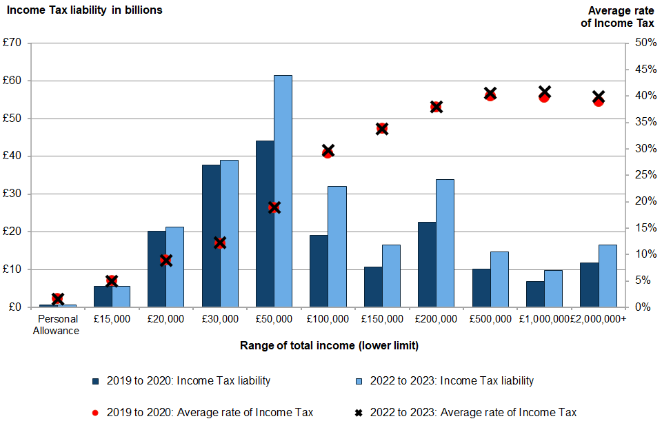Figure 10: A comparison of total Income Tax liabilities and average rate of Income Tax by income range between 2019 to 2020 and 2022 to 2023. The Personal Allowance in 2019 to 2020 was £12,500 compared to £12,570 in 2022 to 2023.