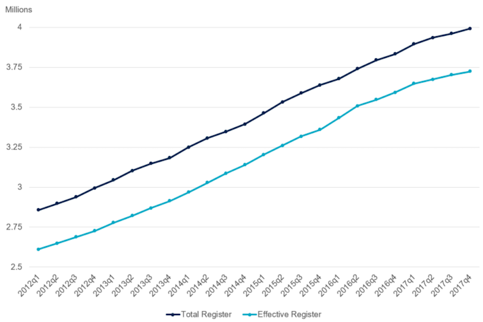 When comparing the first quarter of 2018 with the first quarter of 2017, the UK total register size increased by 136,600 (3.5%), while the effective register size increased by 121,544 (3.3%). Both the total and effective registers have continued to increase in size since the beginning of 2012, despite growth rates for both slowing (e.g. the highest growth rate between the first quarter of the years was between 2013 and 2014 at 6.8%).