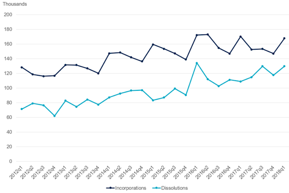 - Between January and March 2018, there were 167,717 company incorporations and 129,688 dissolutions in the UK.