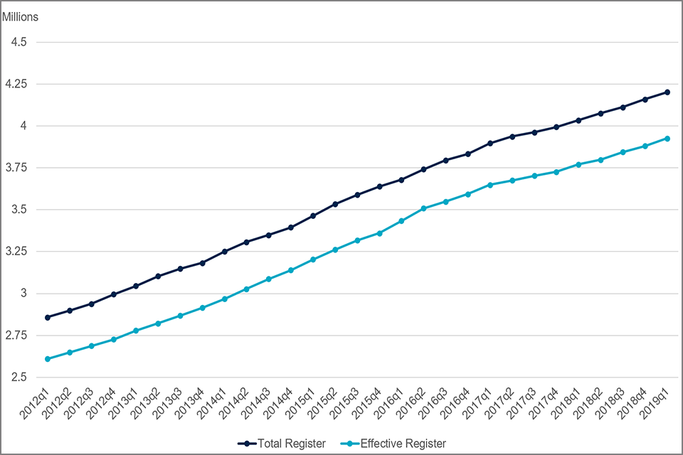 2.1  Chart 1: UK total and effective register sizes, 2012 Q1 to 2019 Q1