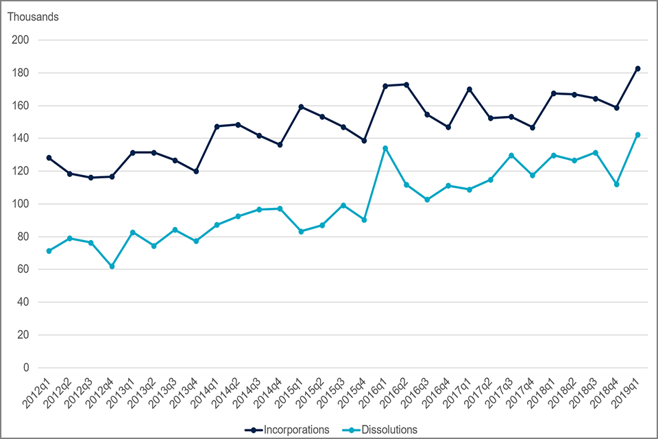 The number of incorporations in the first quarter of 2019 was higher than those seen in the first quarter of 2018; this is consistent with previous years. As with dissolutions, the number of incorporations has continued to increase gradually over time. There were 54,540 (42.5%) more incorporations in the first quarter of 2019 than in the first quarter of 2012.