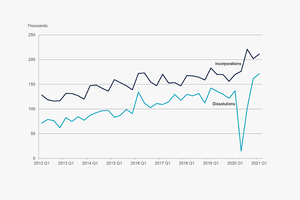 The number of incorporations has continued to increase gradually over time. There were 83,166 more incorporations in the first quarter of 2021 than in the first quarter of 2012, representing an increase of nearly 65%.