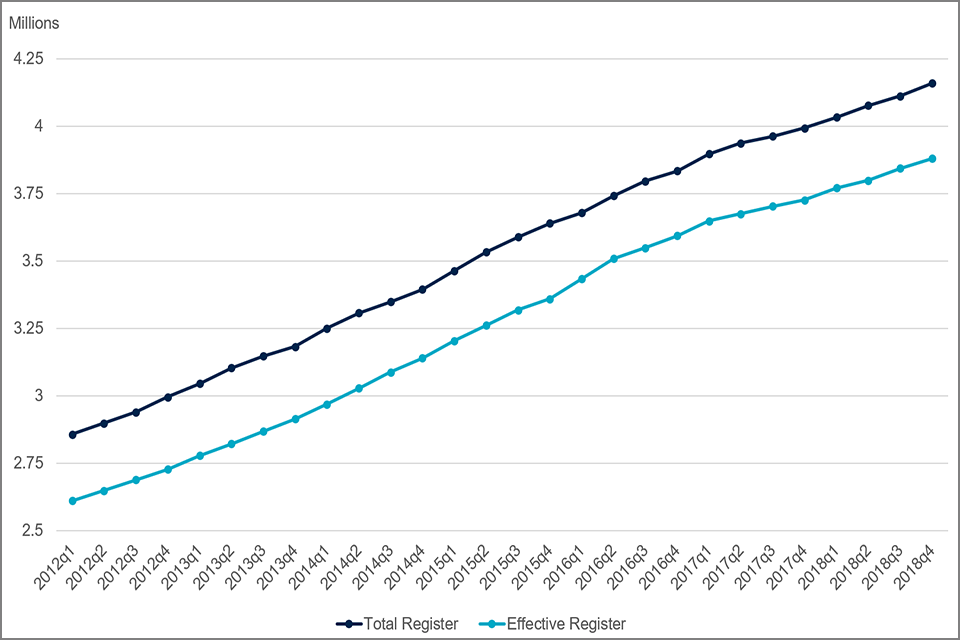 2.1 Chart 1: Total and effective register sizes, 2012Q1-2018Q4, United Kingdom
