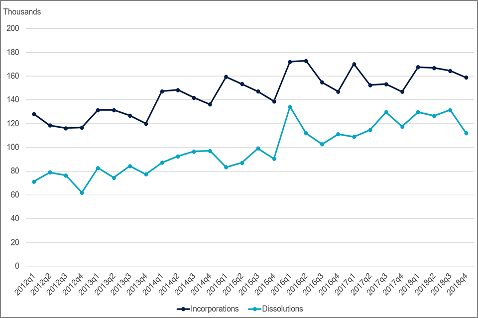 Within 2018, the final quarter saw the fewest number of incorporations, which is consistent with previous years. As with dissolutions, the number of incorporations has continued to increase gradually over time, with a peak in 2016. There were 30,639 (23.9%) more incorporations in the final quarter of 2018 than in the first quarter of 2012.