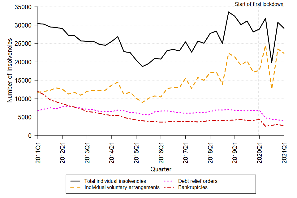 During Q1 2021, there were 29,140 (seasonally adjusted) individual insolvencies, as shown in Figure 1, comprised of 22,354 individual voluntary arrangements (IVAs), 4,143 Debt Relief Orders (DROs) and 2,643 bankruptcies.