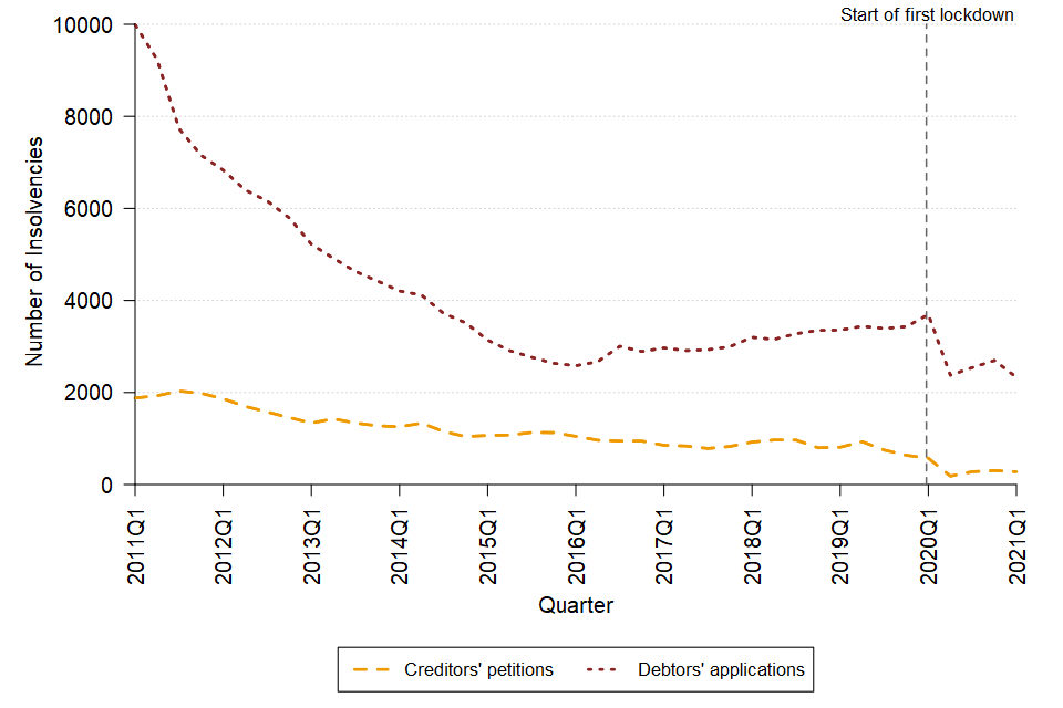A line chart showing the change over time in the quarterly number of bankruptcies by petition type in England and Wales between Q1 2011 and Q1 2021. The data can be found in Table 3a of the accompanying tables. [Source: Insolvency Service]