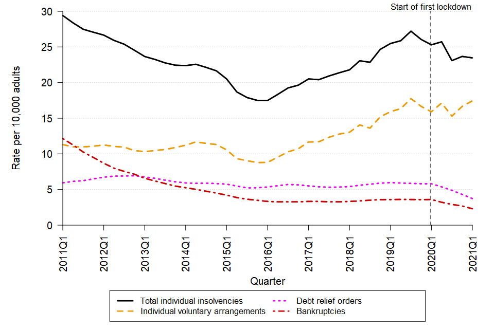 The overall rate of individual insolvency for the four quarters ending Q1 2021 was slightly lower than for the four quarters ending Q1 2020 (25.3 per 10,000 adults, or 1 in 395), as the decline in bankruptcies and DROs compared to Q1 2020 was larger than the increase in IVAs.