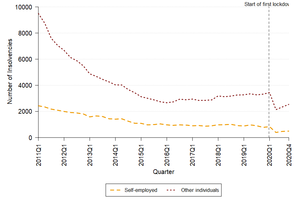 In Q4 2020, there were 493 bankruptcies (seasonally adjusted) where the individual was self-employed, an increase of 4% on Q3 2020 but 37% lower than the same period last year.