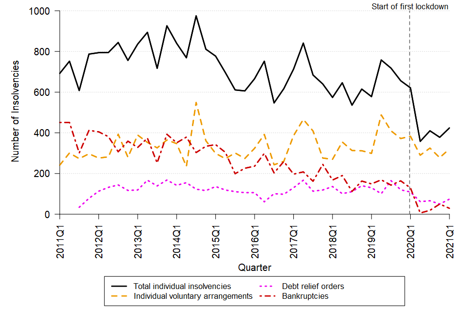 After seasonal adjustment, the number of insolvencies was 5% lower than in Q4 2020, with numbers of IVAs, DROs and bankruptcies all lower.