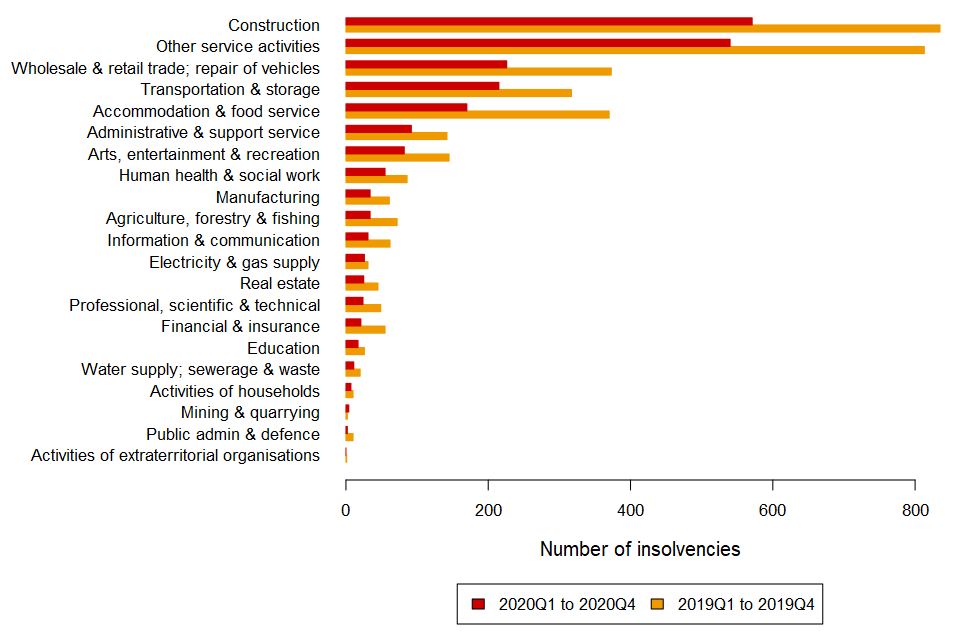 The industries (in accordance with SIC 2007) that experienced the highest number of trader bankruptcies in the 12 months ending Q4 2020 were: