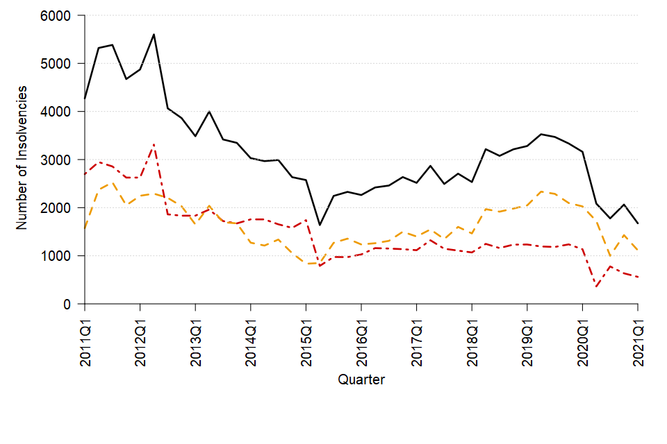 After seasonal adjustment, there were 29,140 total individual insolvencies in Q1 2021, 5% lower than the number of individual insolvencies in the previous quarter and 1% higher than during the same quarter in the previous year.