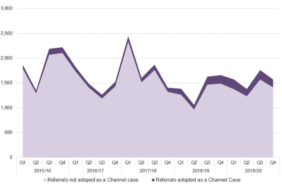 Of the 550 referrals adopted as a Channel case in the year ending March 2020 that subsequently exited the process, 450 (82%) exited with no further radicalisation concerns. This can include individuals: