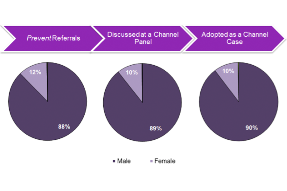 In the year ending March 2020, of the 6,287 referrals, the majority were for males (5,514; 88%). Males also made up the majority of the 1,424 referrals discussed at a Channel panel (1,273; 89%) and the 697 referrals adopted as a Channel case (625; 90%).