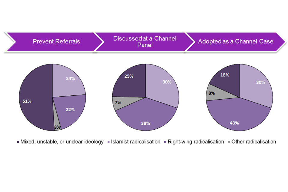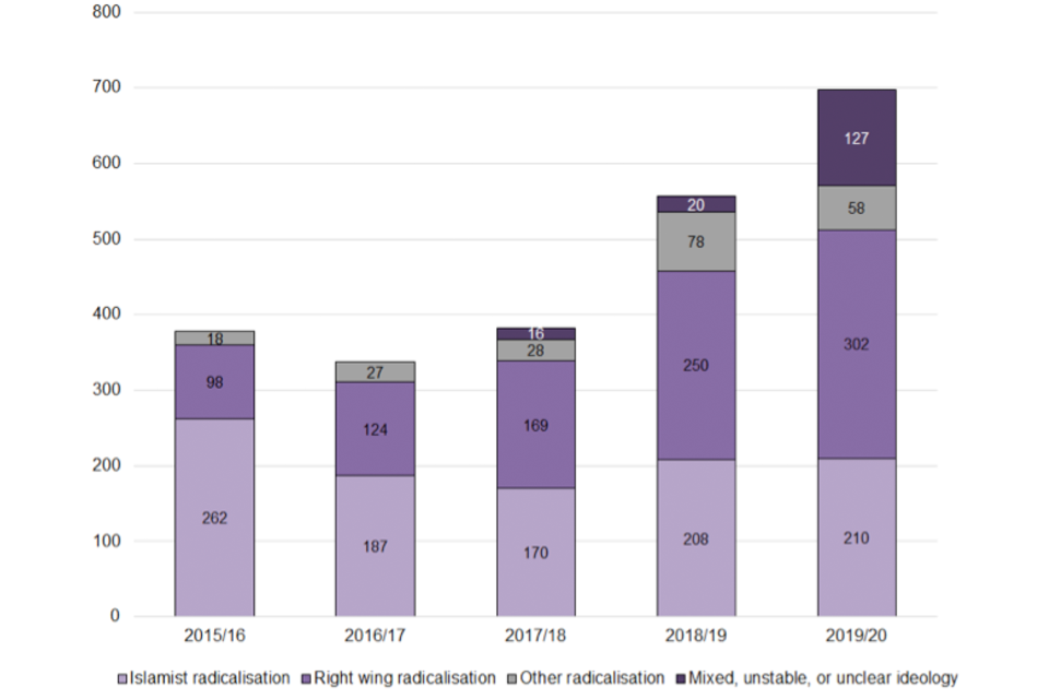 Of the 697 Channel cases, the most common were cases referred due to concerns regarding right-wing radicalisation (302; 43%), followed by Islamist radicalisation (210; 30%).