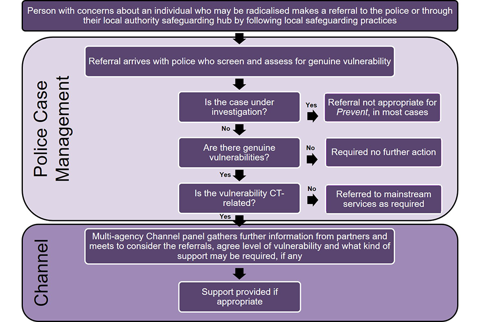 The police screen all referrals to check that the individual is not already or should be part of a terrorism investigation, as these individuals are not appropriate for Channel support. Prevent referrals that may be appropriate for Channel are recorded on the Prevent Case Management Tracker (PCMT). Once this has taken place, the initial assessment may conclude that no further action is required. In other cases, a person’s vulnerability may be assessed as not linked to radicalisation and they may be referred on to another form of support. All Prevent referrals are confidential and do not result in a criminal record or any other form of sanction.