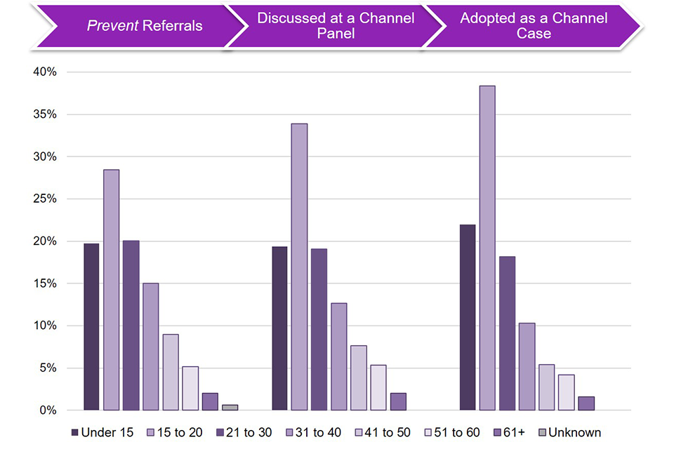 This is in line with previous data since the year ending March 2016, as individuals aged 15 to 20 have consistently accounted for most referrals, discussions at panel and Channel cases.