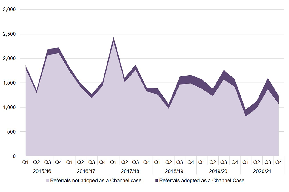 Throughout this release, the number of referrals reported includes individuals who had been referred more than once during the year. This information is included as each referral may not contain the same information (e.g. different sector of referral or type of concern) and may not have the same outcome (e.g. signposted to statutory partners, discussed at a Channel panel). Including multiple referrals provides a more complete picture of all support recorded and provided through the Prevent programme in the year ending March 2021.