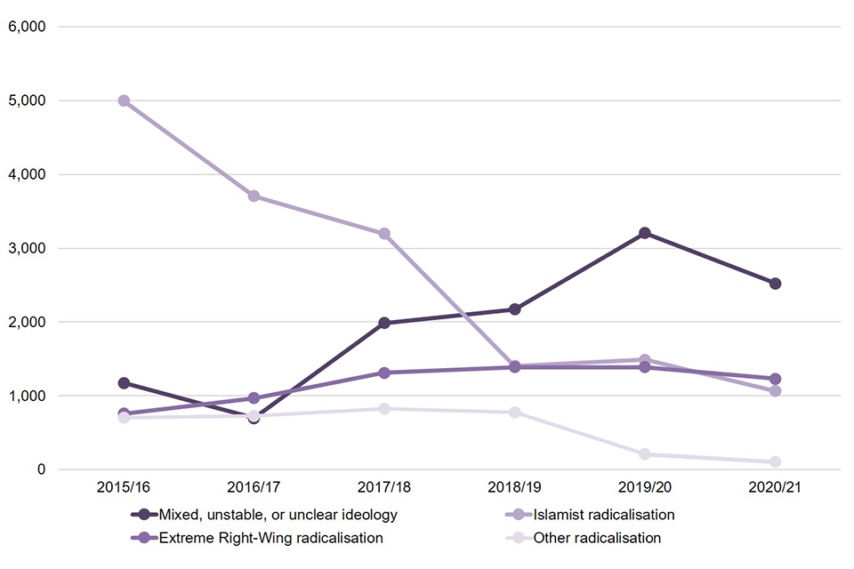 In the year ending March 2021, of the 4,915 referrals to Prevent, half (2,522; 51%) were for individuals with a mixed, unstable or unclear ideology. In line with the overall decrease in total referrals, the number of Prevent referrals regarding individuals with a mixed, unstable or unclear ideology decreased by 21% in the year ending March 2021 compared with the previous year (3,203). This category reflects instances where the ideology presented involves a combination of elements from multiple ideologies (mixed), shifts between different ideologies (unstable), or where the individual does not present a coherent ideology yet may still pose a terrorism risk (unclear). This also includes individuals that may be vulnerable out of a sense of duty, or a desire for belonging and those obsessed with massacre or extreme/mass violence without targeting a particular group.
