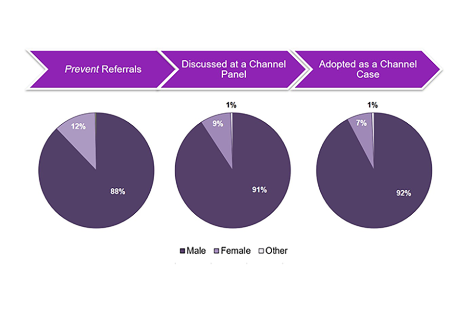 In this report, we refer to gender rather than sex of individuals referred to Prevent. ‘Sex’ can be considered to refer to whether someone is male or female based on their physiology, with ‘gender’ representing a social construct or sense of self that takes a wider range of forms. However, it is likely that recording includes a mixture of physiological and personal identity.