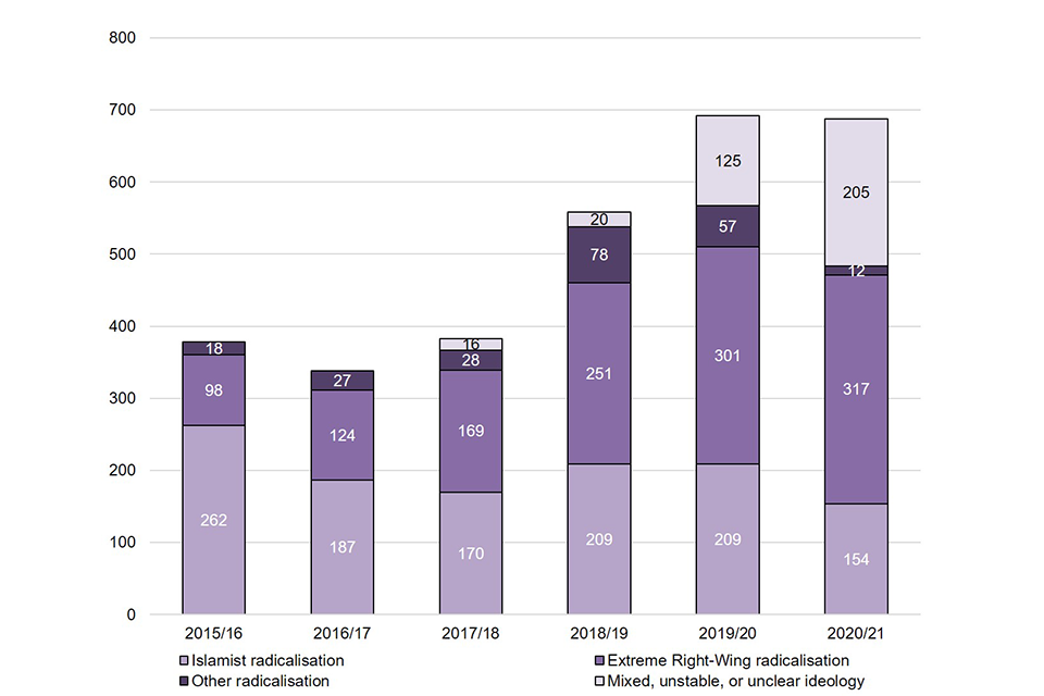 A total of 1,229 referrals (25%) were due to concerns related to Extreme Right-Wing radicalisation. The number of referrals for Extreme Right-Wing radicalisation concerns decreased by 11% compared with the previous year (1,387). In the year ending March 2021, for the first time since comparable data are available (year ending March 2016), there were more Extreme-Right Wing referrals than Islamist referrals.