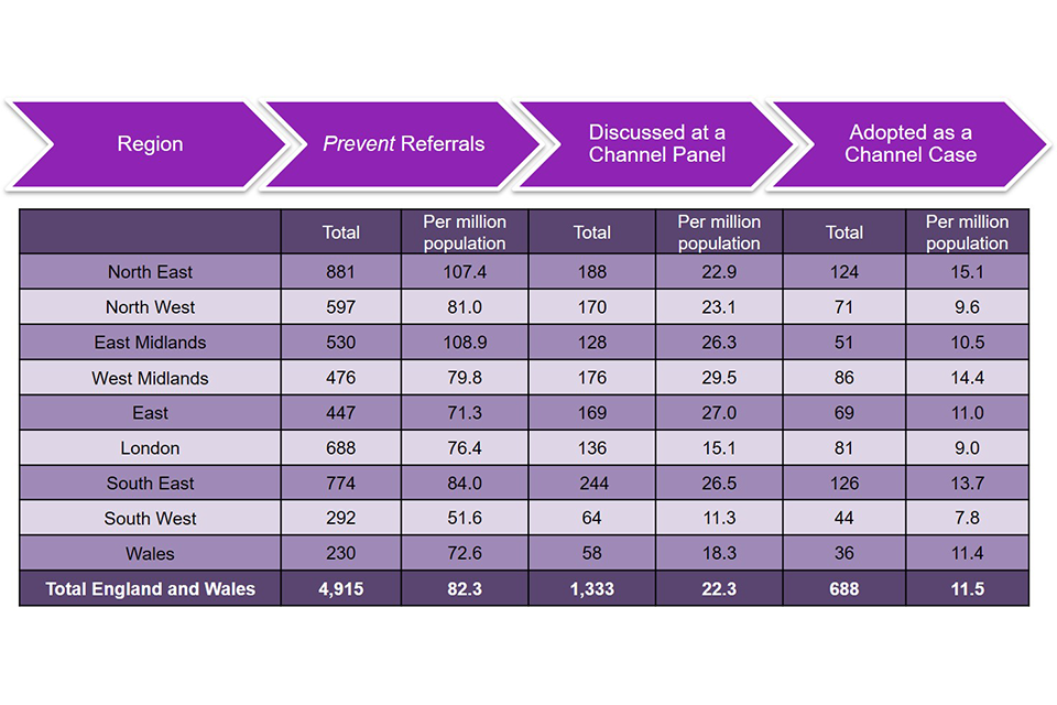 The regional distribution of referrals for Extreme Right-Wing radicalisation concerns per million population at each stage of the Prevent programme varied. The region that received the highest number of referrals per million population was the North East (30.8). However, the region that had the highest number of referrals per million population discussed at a panel (12.3) was the East Midlands, closely followed by the South East (12.3). The North East was also the region that had the highest number of adopted Channel cases per million population (8.8).