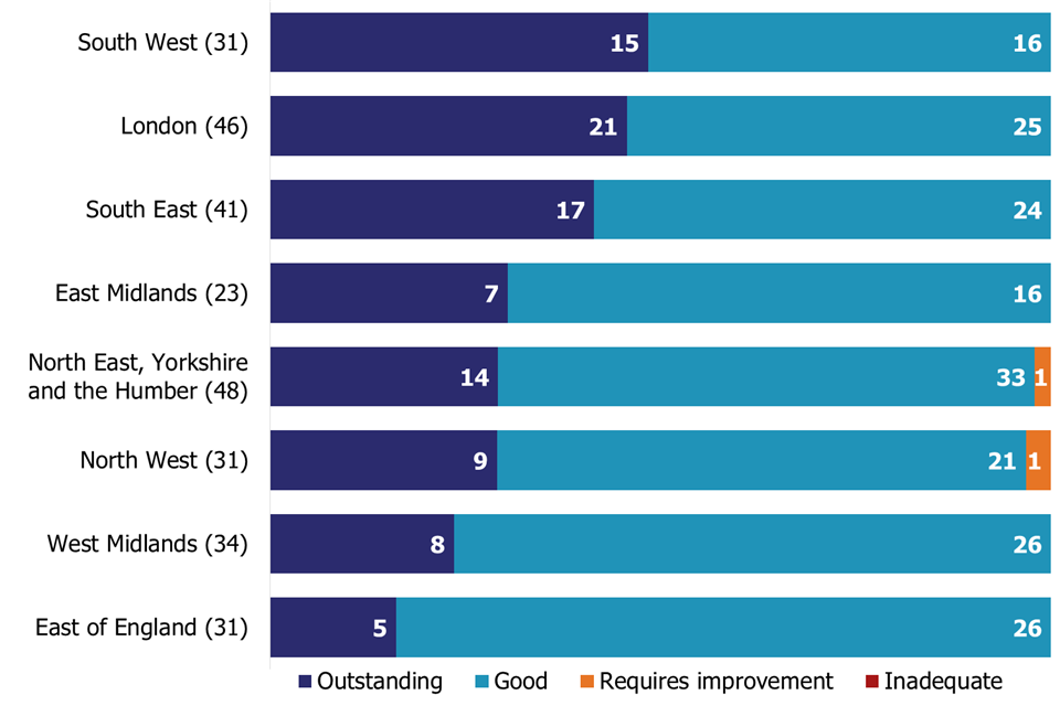 As we would expect from the national picture, inspection outcomes are high across the country. The vast majority of partnerships were judged to be good or outstanding at their most recent inspection in each of the 8 Ofsted regions.