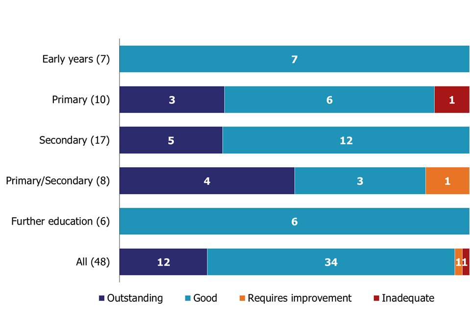 This is the first time that all further education partnerships are good or outstanding (chart 1). This is because, of the 6 further education partnerships inspected this academic year, 5 retained their good grade and the University of Essex improved from requires improvement to good at its single stage inspection.