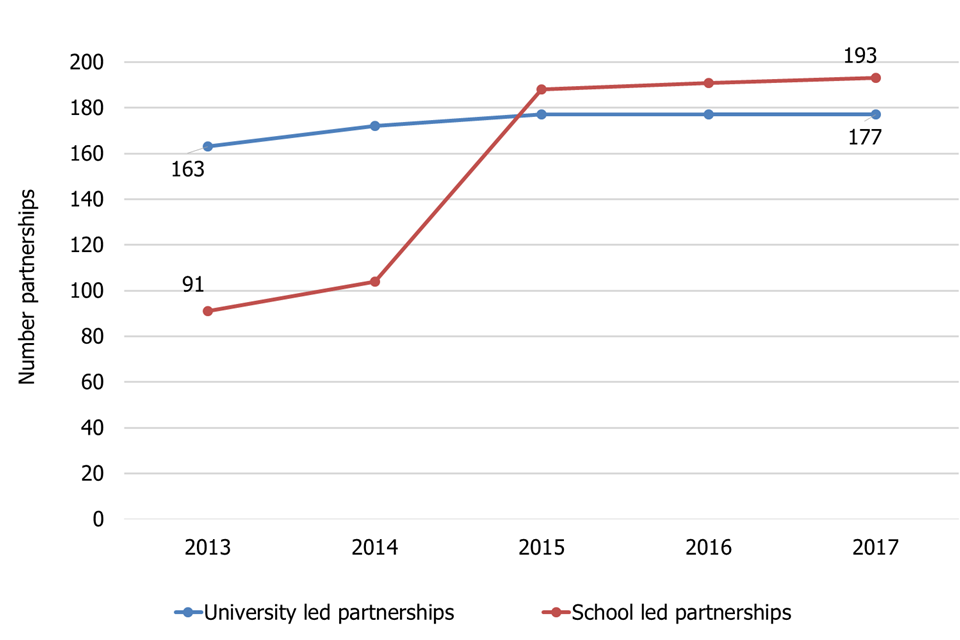 The average number of trainees in school settings in the academic year 2016 to 2017 was about 50; for universities it was about 530. This means that although fewer than half of partnerships are based in universities, just under two-thirds (65%) of trainees are still training in university based partnerships.