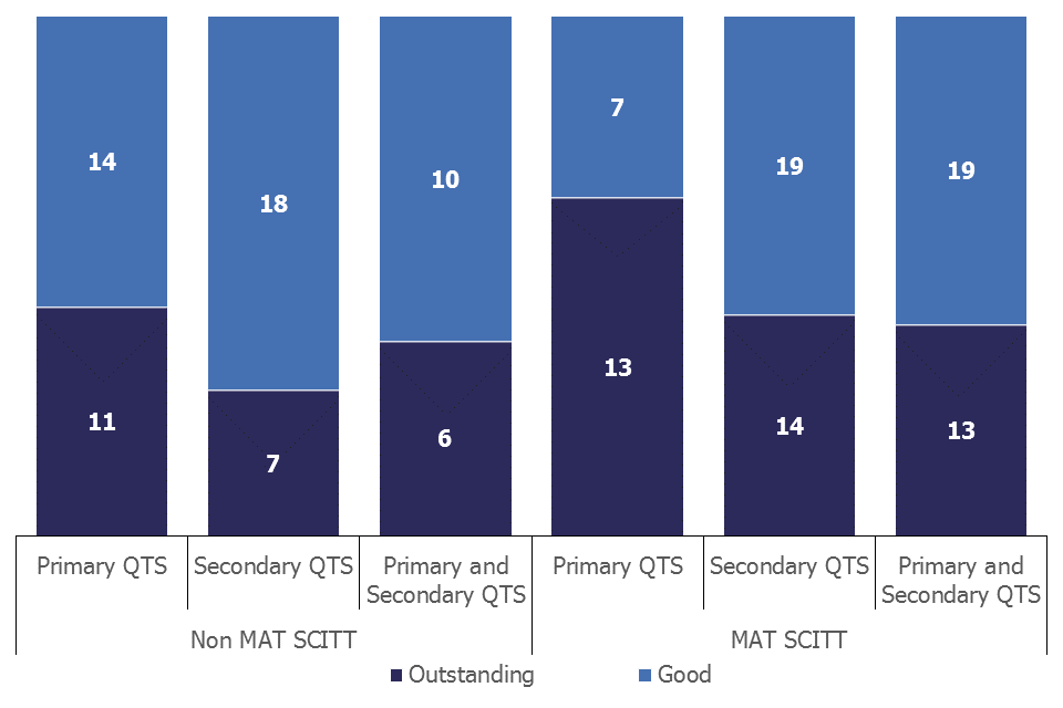 The quality of training is equally high in both school-led and university-led partnerships, with 100% of age phase partnerships for both partnership types judged to be either good or outstanding at their most recent inspection.