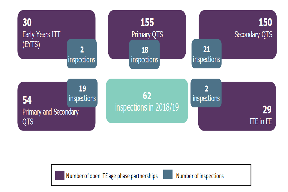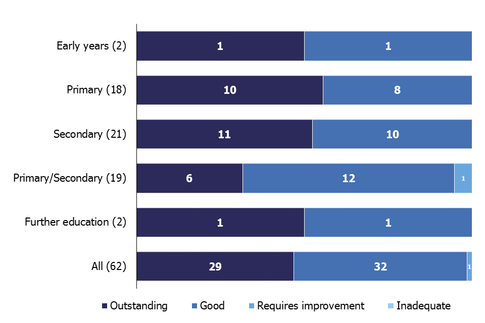 The 50 inspections, conducted in the 2018 to 2019 academic year, resulted in 62 separate inspection outcomes. This is because most partnerships have more than one age phase partnership. Of these, 29 were outstanding, 32 were good and one was judged to require improvement.